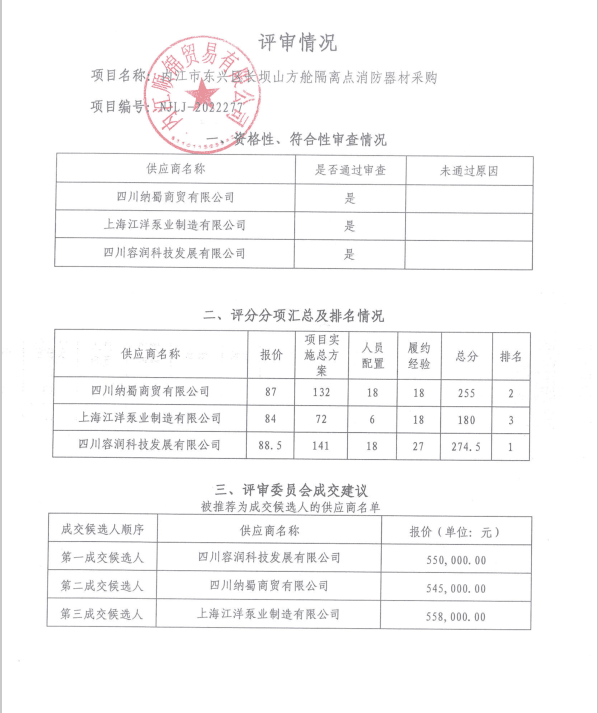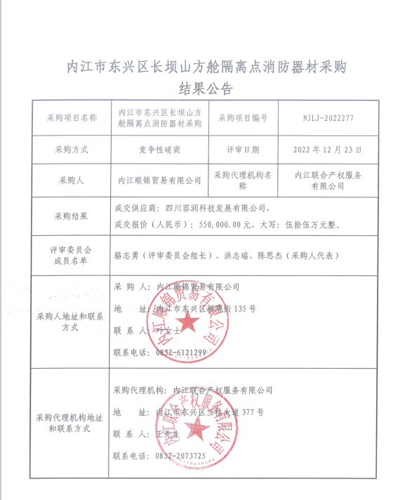 内江市东兴区长坝山方舱隔离点消防器材采购结果公告