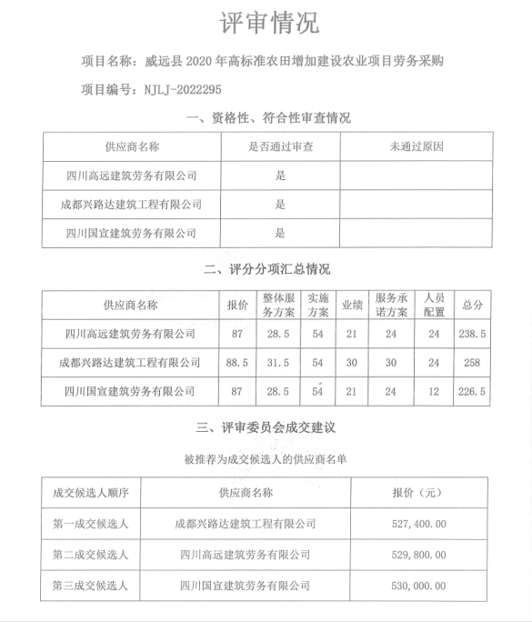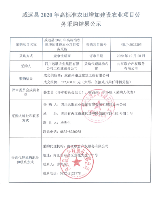 威远县2020年高标准农田增加建设农业项目劳务采购结果公示
