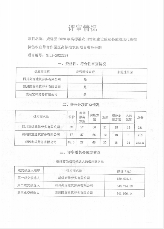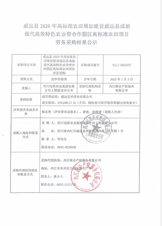 威远县2020年高标准农田增加建设威远县成渝现代高效特色农业带合作园区高标准农田项目劳务采购结果公示