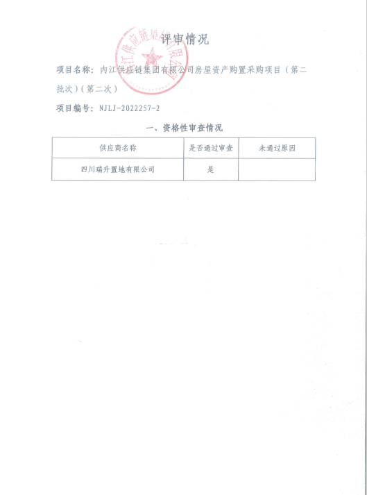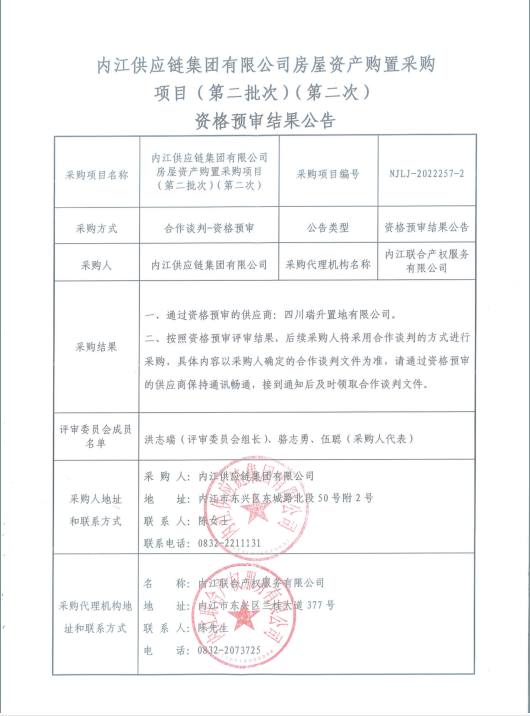 内江供应链集团有限公司房屋资产购置采购项目(第二批次)(第二次) 资格预审结果公告