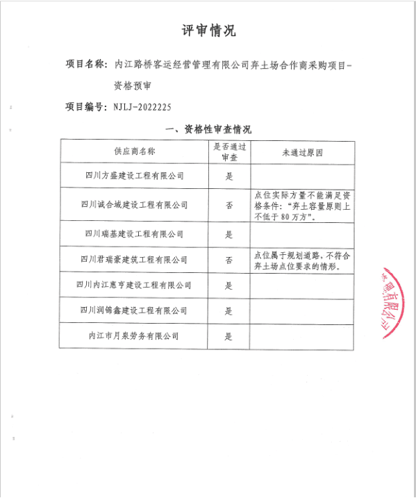 内江路桥客运经营管理有限公司弃土场合作商采购项目资格预审结果公告
