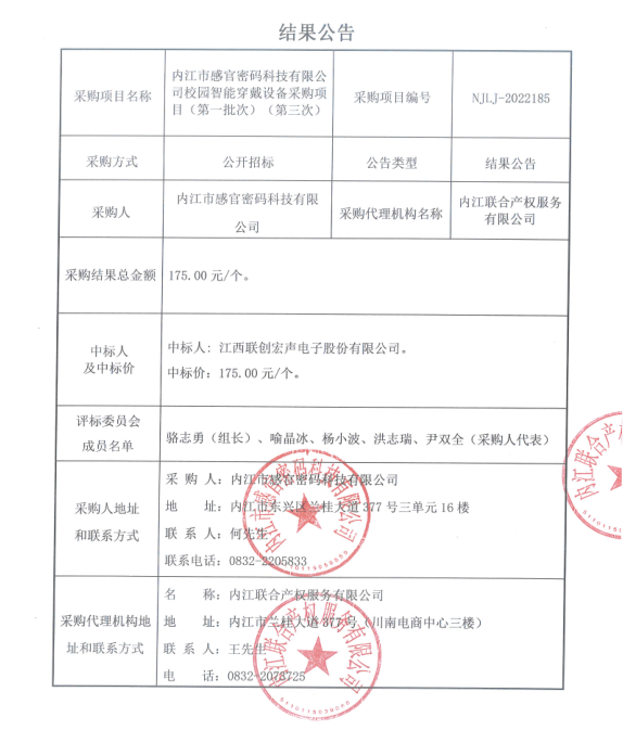 内江市感官密码科技有限公司校园智能穿戴设备采购项目(第一批次)(第三次)结果公告