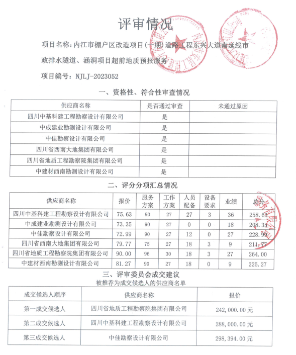 内江市棚户区改造项目(一期)道路工程东兴大道南延线市政排水隧道、涵洞项目超前地质预报服务结果公告