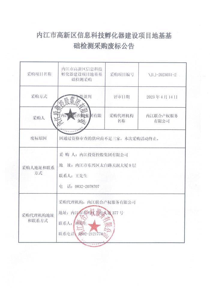 内江市高新区信息科技孵化器建设项目地基基础检测采购废标公告