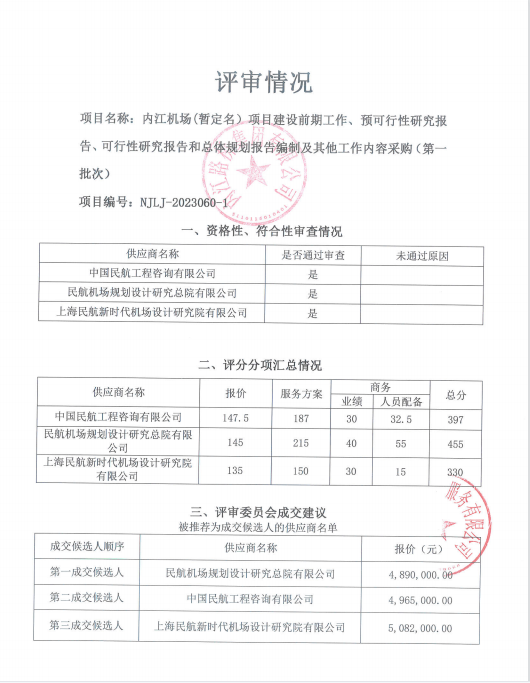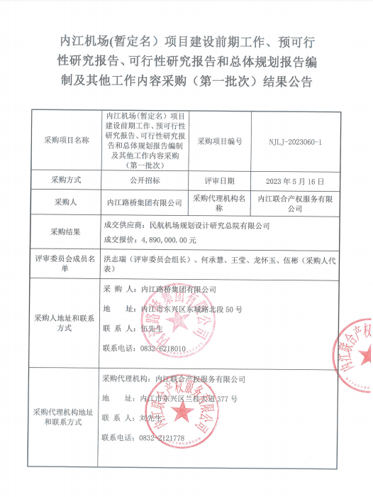 内江机场(暂定名)项目建设前期工作、预可行性研究报告、可行性研究报告和总体规划报告编制及其他工作内容采购(第一批次)结果公告