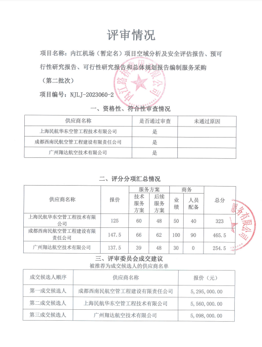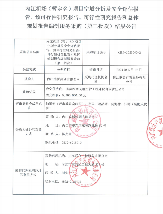 内江机场(暂定名)项目空域分析及安全评估报告、预可行性研究报告、可行性研究报告和总体规划报告编制服务采购 (第二批次)结果公告