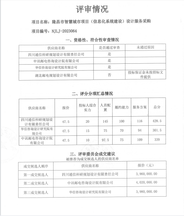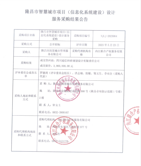 隆昌市智慧城市项目(信息化系统建设)设计服务采购结果公告