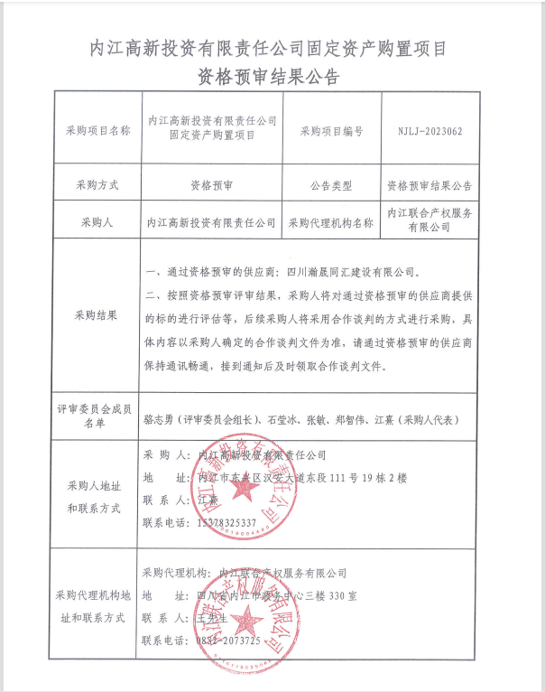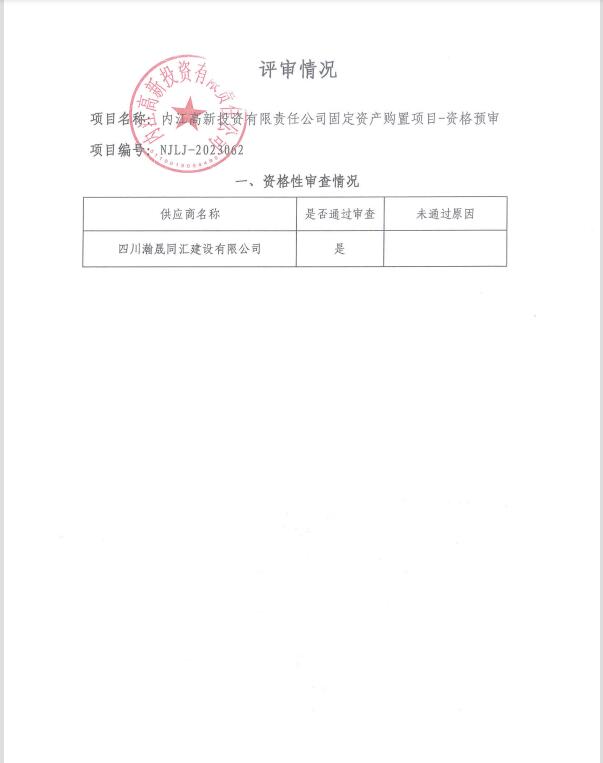 内江高新投资有限责任公司固定资产购置项目资格预审结果公告