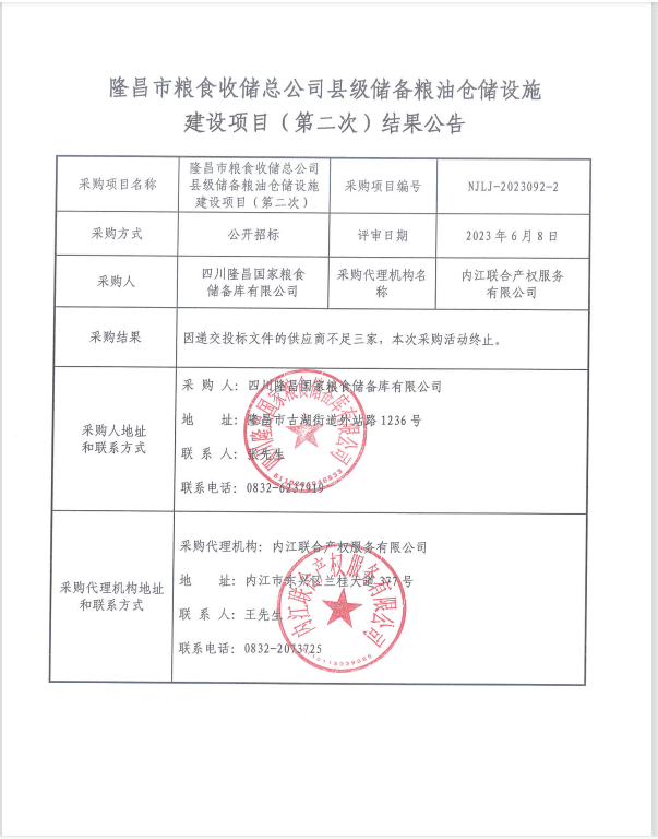 隆昌市粮食收储总公司县级储备粮油仓储设施建设项目(第二次)结果公告