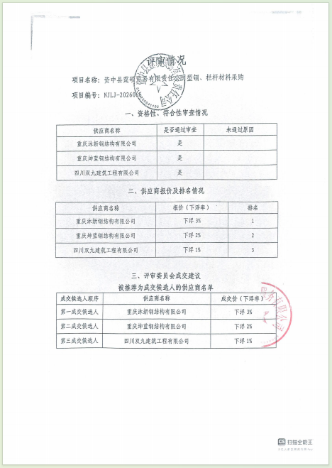 资中县霆硕贸易有限责任公司型钢、栏杆材料采购结果公告